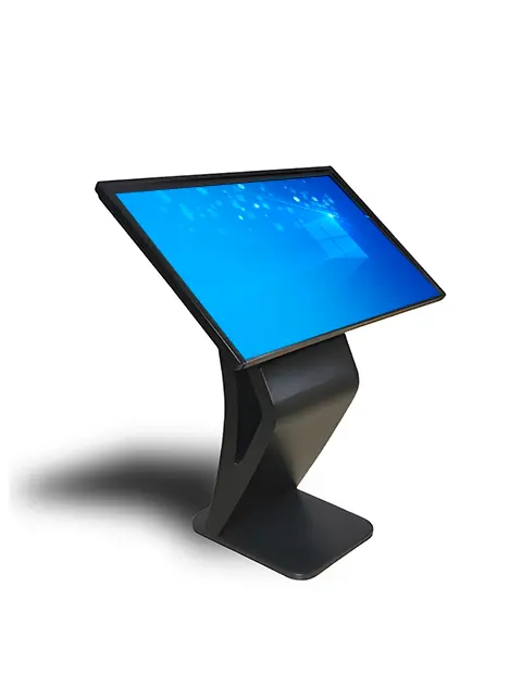 Écran frontal 43’’ et écran tactile 24’’ en 4K, luminosité 450 cd/m², PC Windows intégré avec processeur Intel i5 (8ᵉ gen+), 8 Go RAM et SSD 256 Go. , microphone intégré et connectiques complètes (USB, HDMI, RJ45, audio).